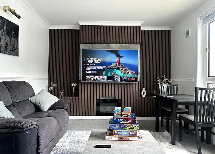La villa Luxury House In Glasgow dispose d'une cuisine complète, ainsi que d'un coin repas pour cuisiner et dîner. Vous pouvez également utiliser un micro-ondes, de la vaisselle et de la verrerie pour préparer votre propre repas. L'arrêt de bus le plus proche est l'arrêt de bus Thornliebank Road / Thornliebank Railway, assez proche de cette villa de 2 chambres. Le logement offre un jardin.
